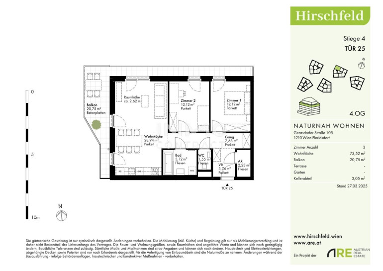 Naturnah und gut angebunden Hirschfeld ist ein beschauliches Viertel am Wiener Stadtrand. Die Metropole im Rücken verheißt jedem Nachhausekommen ein Naturerlebnis und Entspannung. Wer gerne mit den Wiener Linien unterwegs ist, nimmt am besten die Autobuslinie 32A ab Kollarzgasse bis zum U- und S-Bahn-Knotenpunkt Leopoldau. Von hier aus ermöglichen die U1 in Richtung Zentrum sowie die Schnellbahnlinien S1, S2 und S7 eine rasche Verbindung stadtein- und stadtauswärts. Alternativ verläuft die Straßenbahnlinie 31 entlang der Brünner Straße über Floridsdorf direkt bis Schottenring. Autofahrer profitieren von der nahegelegenen A22.