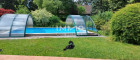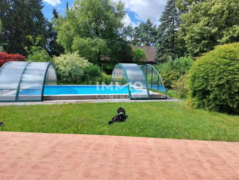 Der Swimmingpool im Garten ist ein Überlaufbecken mit einer Gegenstromanlage und hat eine gläserne Überdachung.