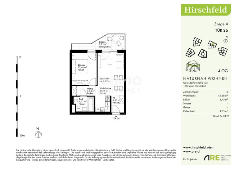 Naturnah und gut angebunden Hirschfeld ist ein beschauliches Viertel am Wiener Stadtrand. Die Metropole im Rücken verheißt jedem Nachhausekommen ein Naturerlebnis und Entspannung. Wer gerne mit den Wiener Linien unterwegs ist, nimmt am besten die Autobuslinie 32A ab Kollarzgasse bis zum U- und S-Bahn-Knotenpunkt Leopoldau. Von hier aus ermöglichen die U1 in Richtung Zentrum sowie die Schnellbahnlinien S1, S2 und S7 eine rasche Verbindung stadtein- und stadtauswärts. Alternativ verläuft die Straßenbahnlinie 31 entlang der Brünner Straße über Floridsdorf direkt bis Schottenring. Autofahrer profitieren von der nahegelegenen A22.