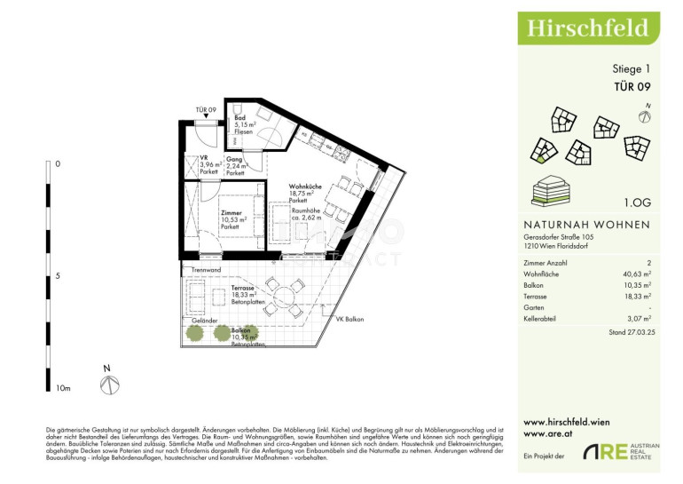Naturnah und gut angebunden Hirschfeld ist ein beschauliches Viertel am Wiener Stadtrand. Die Metropole im Rücken verheißt jedem Nachhausekommen ein Naturerlebnis und Entspannung. Wer gerne mit den Wiener Linien unterwegs ist, nimmt am besten die Autobuslinie 32A ab Kollarzgasse bis zum U- und S-Bahn-Knotenpunkt Leopoldau. Von hier aus ermöglichen die U1 in Richtung Zentrum sowie die Schnellbahnlinien S1, S2 und S7 eine rasche Verbindung stadtein- und stadtauswärts. Alternativ verläuft die Straßenbahnlinie 31 entlang der Brünner Straße über Floridsdorf direkt bis Schottenring. Autofahrer profitieren von der nahegelegenen A22.