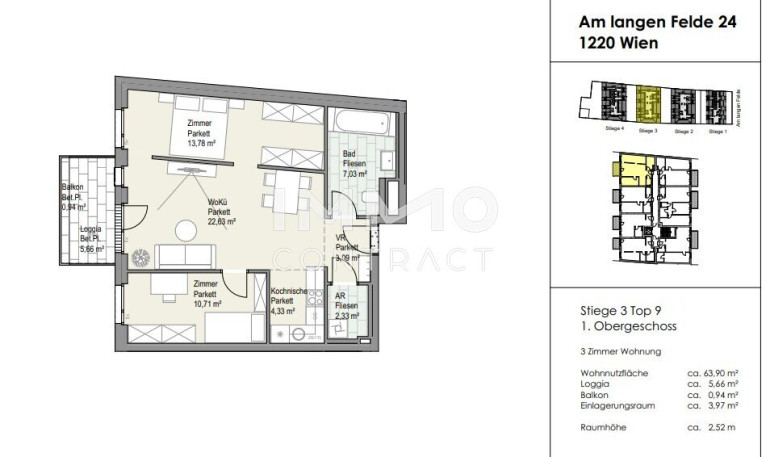 Wohnen Am Langen Felde 24 – fertiggestellt, hochwertig & gut angebundenIm 22. Wiener Gemeindebezirk, nahe der U1-Station Kagraner Platz, stehen bereits fertiggestellte Eigentumswohnungen zum Einzug bereit. Die Wohnhausanlage mit vier Stiegen und Tiefgarage überzeugt durch eine erstklassige, energieeffiziente Bauweise mit Fernwärme, Photovoltaikanlage und Fußbodenheizung – ideal für alle, die nachhaltig und zukunftssicher wohnen möchten.