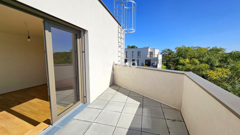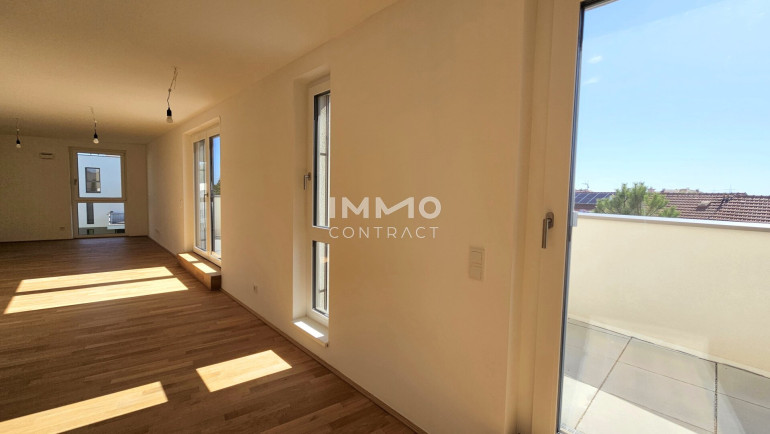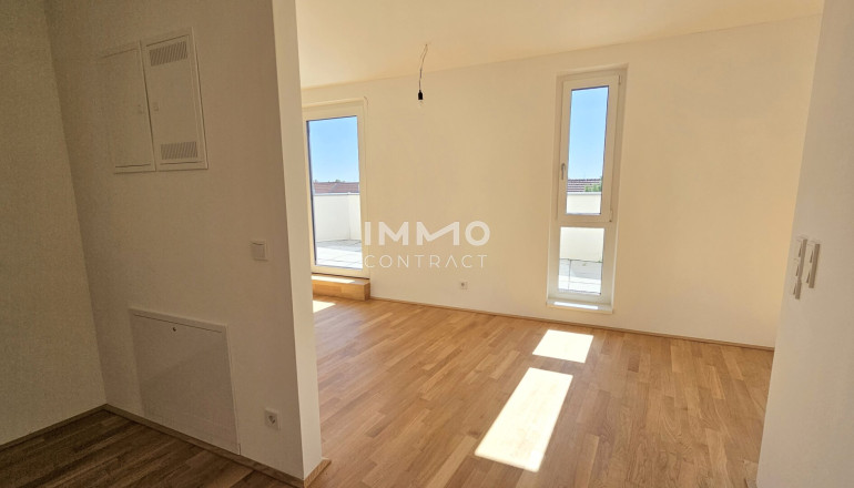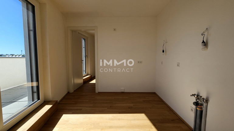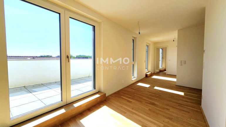 Diese individuelle, lichtdurchflutete 2-Zimmer-Wohnung ist nach Süden ausgerichtet und befindet sich barrierefrei im Dachgeschoß. Sie besteht aus einer großen Wohnküche und Ausgang auf die ca. 24 m2 große Dachterrasse. Das Wohn-/Esszimmer ist mit seinen 37 m2 groß genug dimensioniert, dass sogar ein Homeoffice Platz untergebracht werden kann. Auch vom Schlafzimmer haben Sie Zutritt zur Terrasse, das en-suite Badezimmer ist mit Dusche und Waschmaschinenanschluss ausgestattet und zeitlos weiß verfließt. Des Weiteren finden Sie noch ein großes Vorzimmer und ein separates Gäste-WC vor.