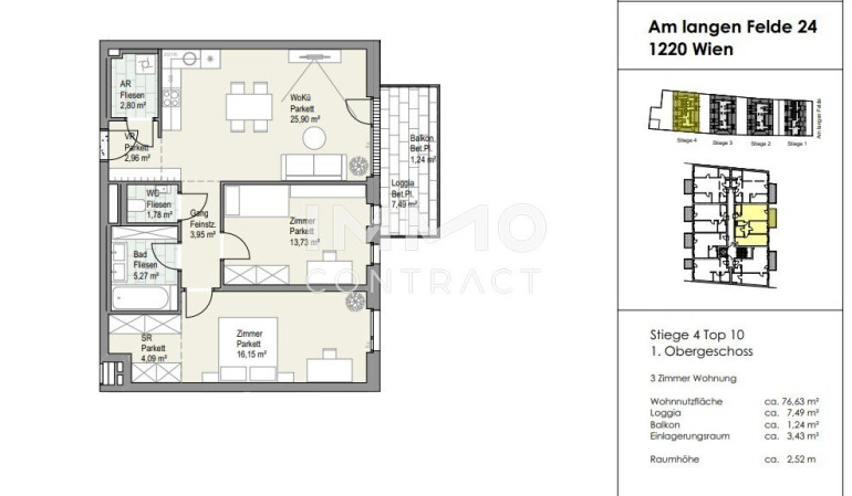 Wohnen Am Langen Felde 24 – fertiggestellt, hochwertig & gut angebundenIm 22. Wiener Gemeindebezirk, nahe der U1-Station Kagraner Platz, stehen bereits fertiggestellte Eigentumswohnungen zum Einzug bereit. Die Wohnhausanlage mit vier Stiegen und Tiefgarage überzeugt durch eine erstklassige, energieeffiziente Bauweise mit Fernwärme, Photovoltaikanlage und Fußbodenheizung – ideal für alle, die nachhaltig und zukunftssicher wohnen möchten.