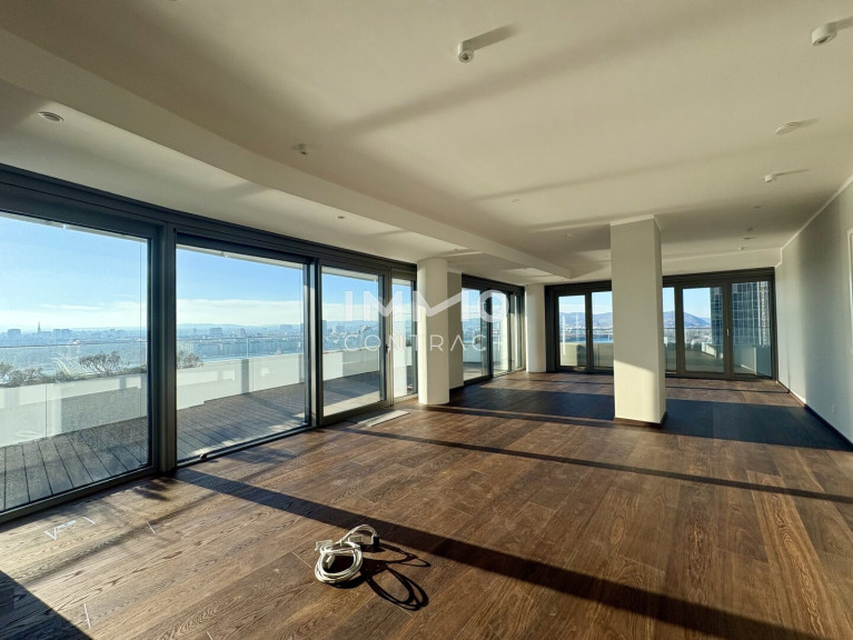 Das absolute Highlight ist der über 70 m² große Balkon: Sonne begleitet Sie hier vom Vormittag bis zum stimmungsvollen Sonnenuntergang hinter dem Kahlenberg. Der Ausblick ist schlichtweg spektakulär – von der Wiener Innenstadt mit Stephansdom, Prater und Riesenrad bis hin zur umliegenden Natur der Donauinsel, Neuen Donau bis hin zu den Hausbergen Wiens.