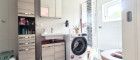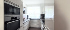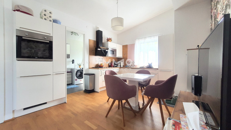 Im hinteren Bereich des Wohnzimmers liegt die hochwertige Einbauküche. Über einen kleinen Gang gelangt man zu den zwei Schlafzimmern, dem Tageslicht-Bad und dem separaten WC. Ein Abstellraum und der ebenerdig gelegene Lagerraum bieten viel Stauraum.