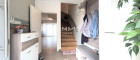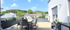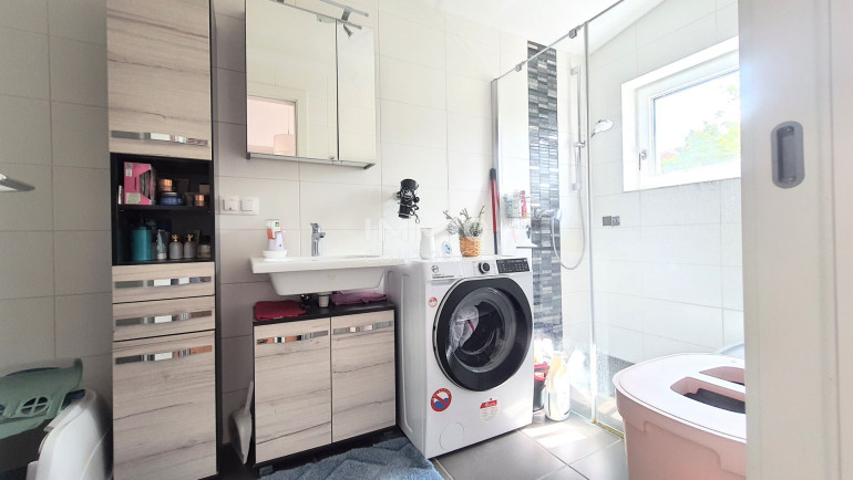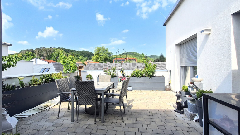 Über eine schöne geschwungene Holztreppe gelangt man ins Obergeschoß, das eine selbständige Wohneinheit bildet. Das gemütliche Wohnzimmer mit integrierter Wohnküche führt in zwei Schlafzimmer. Auf dieser Ebene befindet sich ebenfalls ein Tageslicht-Bad. Auf die große Dachterrasse gelangt man sowohl vom Wohnzimmer als auch den beiden Schlafzimmern. Von hier genießt man den schönen Blick auf den Wienerwald.