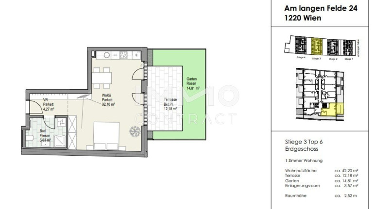 Wohnen Am Langen Felde 24 – fertiggestellt, hochwertig & gut angebundenIm 22. Wiener Gemeindebezirk, nahe der U1-Station Kagraner Platz, stehen bereits fertiggestellte Eigentumswohnungen zum Einzug bereit. Die Wohnhausanlage mit vier Stiegen und Tiefgarage überzeugt durch eine erstklassige, energieeffiziente Bauweise mit Fernwärme, Photovoltaikanlage und Fußbodenheizung – ideal für alle, die nachhaltig und zukunftssicher wohnen möchten.