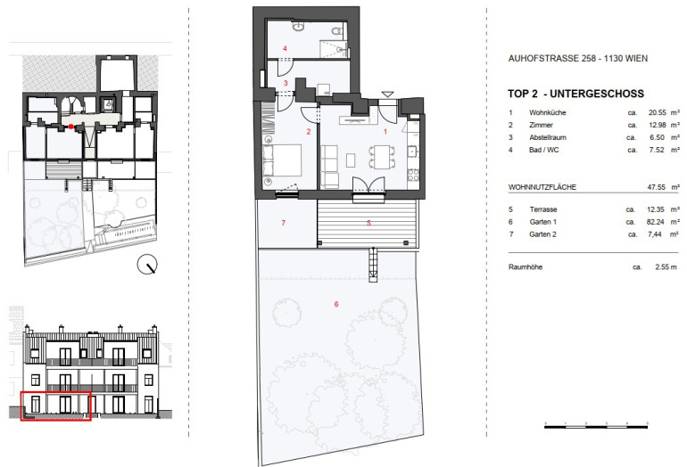 Die im Gartengeschoß gelegene, smart geschnittene 2-Zimmer-Wohnung bietet auf 48 m² modernen Komfort in historischem Ambiente. Die Einheit verfügt über eine großzügige Wohnküche, ein Schlafzimmer, einen geräumigen Abstellraum sowie ein praktisches Duschbad. Das Highlight der Top 2 ist der private Gartenanteil mit 90 m² mit Baumbestand und Heckenbepflanzung. Die wettergeschützte 12 m² Terrasse sorgt für entspannte Stunden im Grünen.