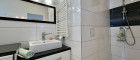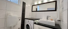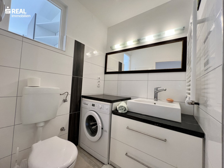 - modernes Badezimmer mit Dusche, Waschtisch, Waschmaschinenanschluss und WC