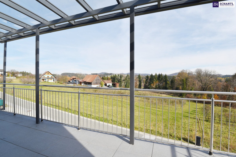 - 360°-Panorama-Dachterrasse mit ungefähr 60m², Wasseranschluss und Blick über die steirischen Weinberge