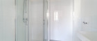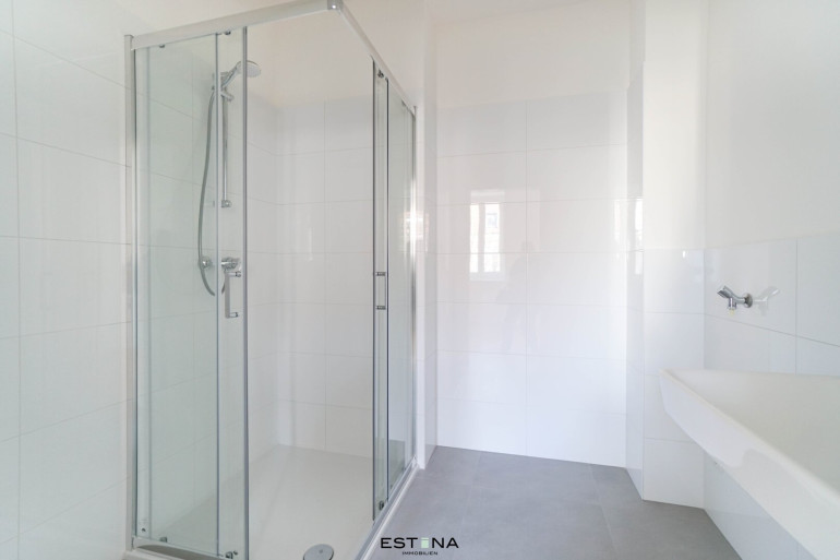 - Badezimmer mit Dusche, Waschbecken und Waschmaschinenanschluss