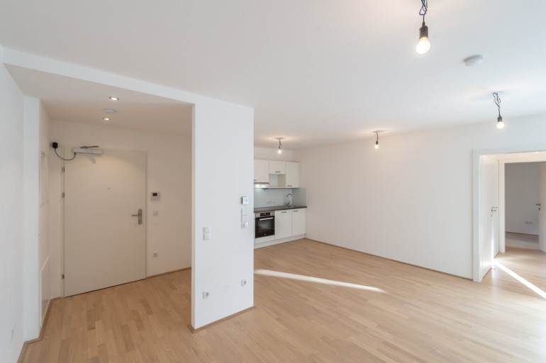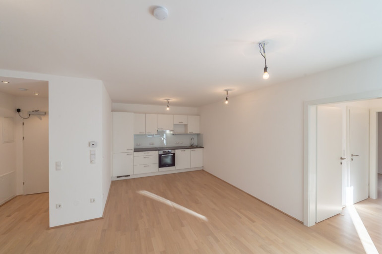 Top 19: Diese wunderschöne 58m² große Neubauwohnung gliedert sich in einen großzügigen Wohnbereich mit Einbauküche, einen Flur mit Ausgang auf den Balkon, ein großzügiges Schlafzimmer mit en suite Badezimmer, ein getrenntes WC und einen Vorraum.