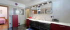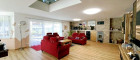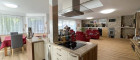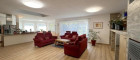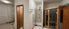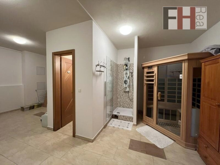 Das Untergeschoss mit dem einzigartigen Wohnsalon begeistert bereits beim Betreten aufgrund seiner Großzügigkeit. 70m² lichtdurchflutete Fläche, der schöne Erkerbereich, die große, offene Küche vom Markenhersteller DAN, der Kamin und der Ausgang auf die vorgelagerte Terrasse und in den Garten, überzeugen auf den ersten Blick. Ein tolle Atmosphäre für alle Jahreszeiten, hier lässt es sich wirklich wunderbar leben. Der eingebaute Kaminofen in eine mit Steinfliesen bestückte Wand, ist nicht nur optisch eine Bereicherung, sondern die zusätzlichen Funktion der Wassererwärmung für die zentrale Heizungsanlage zeugt von einer durchdachten Planung. Der hintere Bereich des Untergeschosses dient nicht nur als Kellergeschoss mit Lagerfläche und Platz für die Technik etc., sondern der größte Raum wurde mit Dusche, Infrarotkabine und Trainingsgeräten als Wellnessbereich ausgebaut.