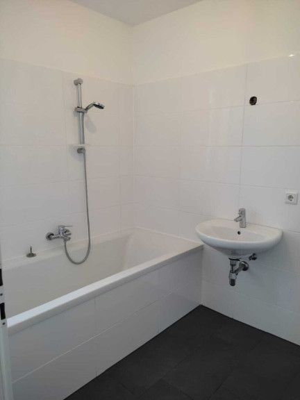 - Badezimmer mit Badewanne, Waschbecken und Waschmaschinenanschluss