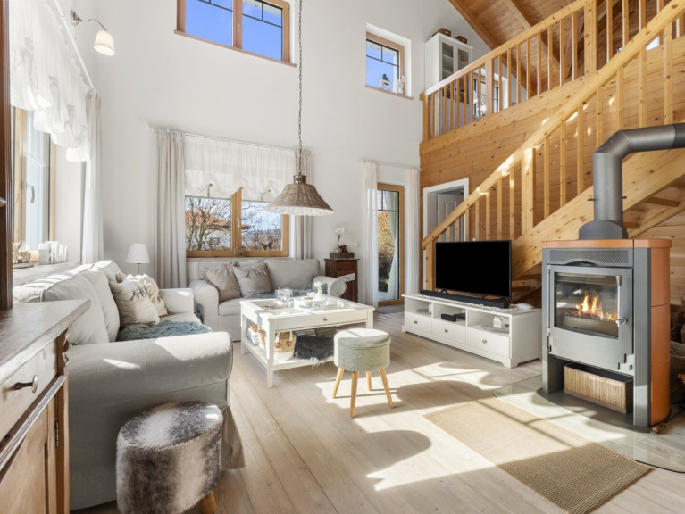 Beheizt wird das Haus energieeffizient mit einem Schwedenofen, der eine besonders wohlige Wärme abstrahlt und das typische, gemütliche Schwedenhaus-Gefühl perfekt abrundet.