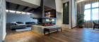 Wohnbereich: Große Fenster, elegantes Lounge-Mobiliar und modernste Lichttechnik schaffen ein Ambiente aus hochwertigem Industrial Design und dennoch warmer Geborgenheit – mit Kamin und einem weiteren Ambiente-Feuer. Hinter einer Nische verbirgt sich eine Klavierecke. Von hier führt eine Treppe in das obere Galeriegeschoß.
