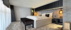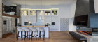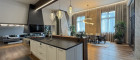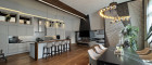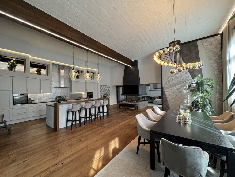Essbereich: Durch einen attraktiven verglasten Raumteiler betritt man den Essbereich mit einer voll ausgestatteten Designküche. Eine moderne Inselküche mit Natursteinoberflächen, integriertem TV und edlen Beleuchtungselementen bildet das Herzstück. Ergänzt wird sie durch ein optisches Ambiente-Feuer, das für stilvolle Stimmung sorgt.