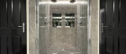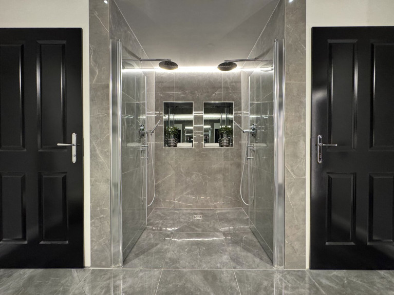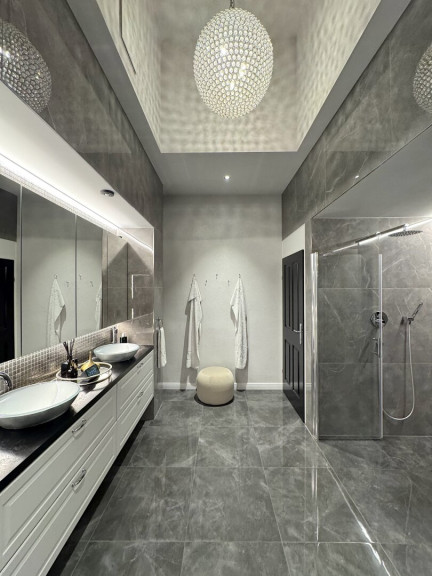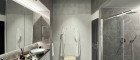 Eingangsbereich: Eingebaute Garderobe bzw. Schrankraum sowie ein elegantes Badezimmer mit Doppeldusche und separatem WC. Das Badezimmer ist mit hochwertigem silbergrauem Feinsteinzeug und passendem Interieur ausgestattet. Über eine Treppe gelangt man zur freistehenden Badewanne auf der Galerieebene.