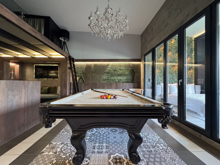 Gesellschaftszimmer: Durch das Wohnzimmer gelangt man in das Gesellschaftszimmer – ein Highlight für Geselligkeit und Unterhaltung, ausgestattet mit integriertem TV, Bose- und Teufel-Soundsystem sowie einem edlen 8-ft-Billardtisch auf Schieferplatte. Ein eingebautes Tisch-Ensemble rundet den Raum perfekt ab – ideal für einen geselligen Abend.