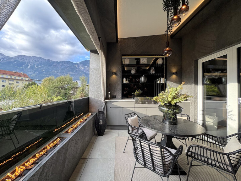 Loggia: Von hier aus betritt man die ca. 16,3 m² große, überdachte Loggia mit Gas-Ambiente-Feuer, integriertem Plancha-Grill und Lounge. Ein luftiger, geschützter Außenbereich zum Genießen lauer Sommerabende mit Blick nach Nordwesten und auf die Bergwelt.