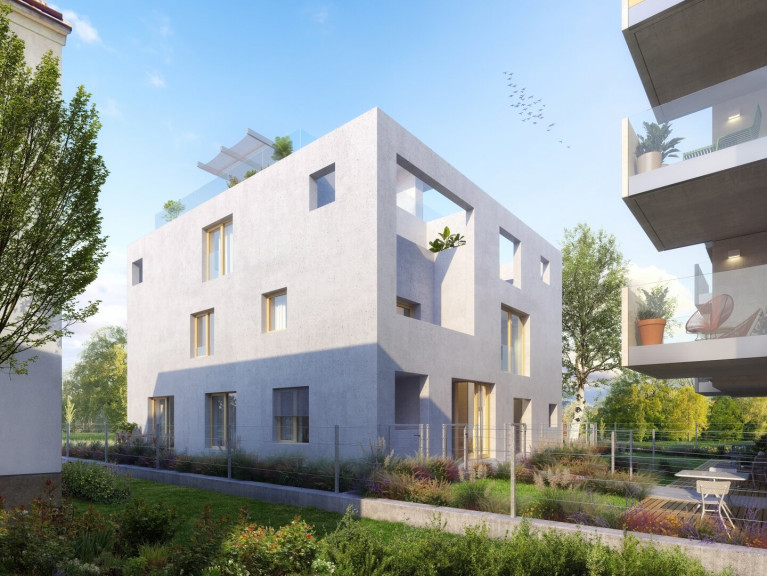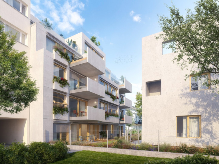 In der SPEISING:70 entsteht ein modernes Wohnprojekt mit zwei Baukörpern in reduzierter, kubistischer Architektur. Zur Straße hin öffnet sich ein Gebäudeteil mit kompakteren Wohneinheiten, deren flächenbündige Fichtenholz-Fenster dem Ensemble ein unverwechselbares Erscheinungsbild verleihen. Einzigartige Markisoletten sorgen für stilvollen Sonnenschutz und setzen gleichzeitig gestalterische Akzente. Die hofseitig ausgerichteten, größeren Wohnungen profitieren von einer ruhigen, westseitigen Lage und besonders großzügigen Außenflächen.