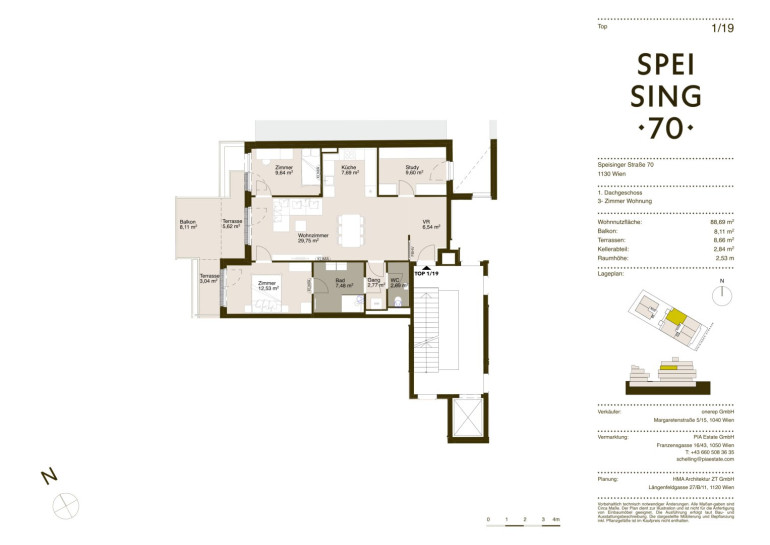 Über dem straßenseitigen Bauteil ist eine Dachterrasse mit Summer Kitchen und Außendusche geplant. Diese wird allen Bewohnern die Möglichkeit bieten, über den Dächern Wiens auszuspannen und den Weitblick zu genießen. Darüber hinaus verfügen ausgewählte Wohnungen über westseitig ausgerichtete, zugeordnete Dachterrassenabteile zur exklusiven Nutzung.