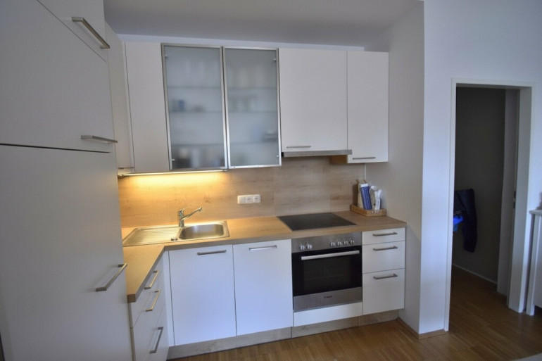 Die Küche ist möbliert und mit E-Geräten ausgestattet. Das Badezimmer verfügt über eine Badewanne, das WC ist getrennt vom Badezimmer. Ein praktischer Abstellraum sorgt für zusätzlichen Stauraum. Ein Lift im Haus gewährleistet einen komfortablen Zugang zur Wohnung.