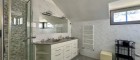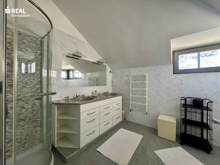 Das 10 m² große Badezimmer mit Fenstern ist mit einer Dusche, Doppelwaschtisch und Platz für die Waschmaschine ausgestattet, ursprünglich war hier auch eine Eckbadewanne und ein zusätzliches WC eingebaut, dies wurde jedoch im Zuge der Renovierung 2006 entfernt. Vom Vorraum erreicht man die Toilette und auch einen praktischen Abstellraum.