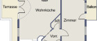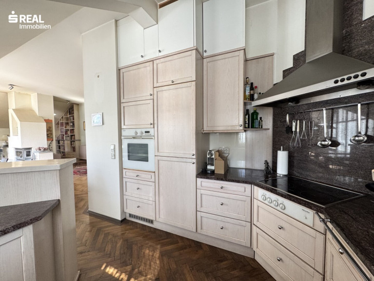 Die Wohnung befindet sich im 2. und letzten Stockwerk (ohne Lift) und besticht durch ihren eleganten und außergewöhnlichen Grundriss, der zudem viel Platz für individuelle Gestaltungsmöglichkeiten bietet. Das Herzstück bildet der 56 m² große Wohnbereich, der neben der integrierten Küche samt Essplatz auch einen geschickt abgeteilten, erhöhten Arbeitsplatz bietet - von hier gelangt man auf die 14 m² große Sonnenterrasse.