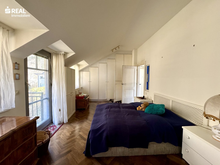 Das Schlafzimmer mit 22 m² ist ebenso großzügig konzipiert, vom Tischler geplante und hochwertig ausgeführte Einbaukästen bieten viel Stauraum und auch hier gelangt man auf einen 5 m² großen Balkon mit Blick ins Grüne.