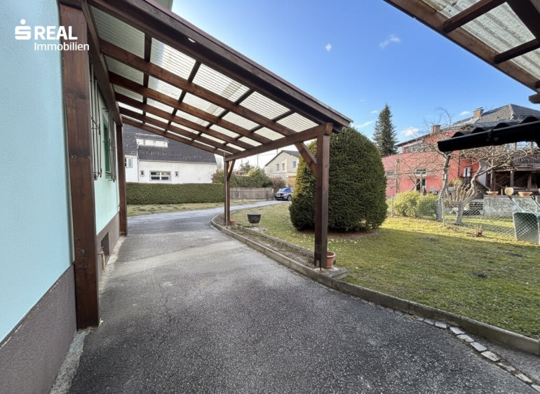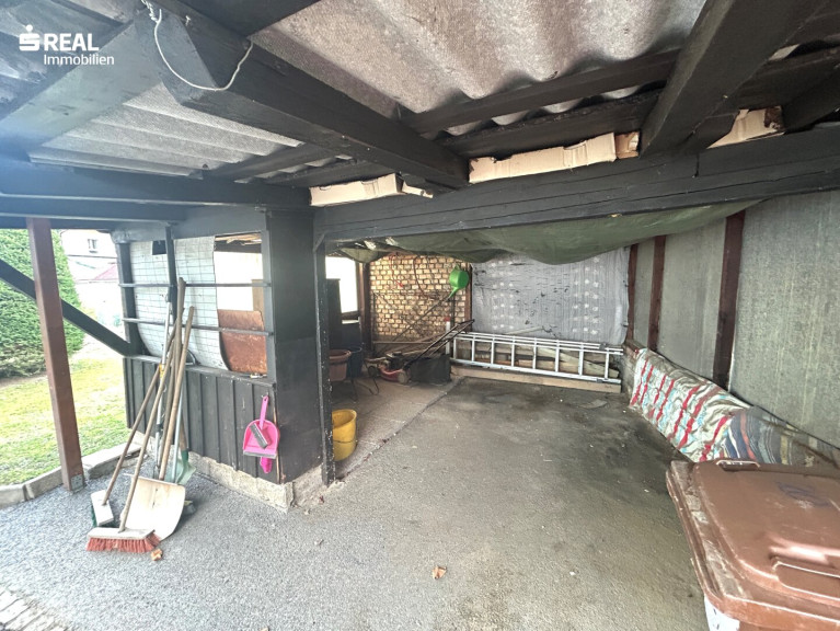 Zusätzlich ist Richtung Westen ein überdachter Carportbereich und ein offener Schuppen mit Vordach errichtet worden.
