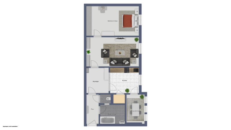 Die Wohnung im 2. Obergeschoss (derzeit ohne Lift, ein solcher ist aber in naher Zukunft geplant) bietet auf rund 74,18 m² eine praktische Raumaufteilung bestehend aus Küche, zwei Zimmern (Durchgangszimmer), Vorraum, Bad, WC, einem Wintergarten – ideal als Esszimmer nutzbar – sowie einem Abstellraum.