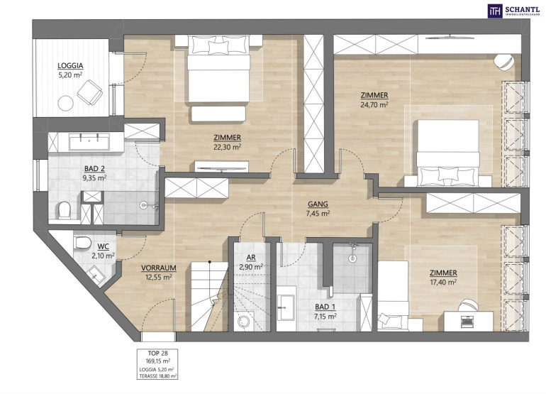 Der Zugang zur Wohnung erfolgt im ersten Dachgeschoss über einen rund 12 Quadratmeter großen Vorraum, von dem aus alle Räume dieser Ebene zentral erschlossen werden. Hier befinden sich drei Schlafzimmer mit Größen von etwa 17, 25 und 22 Quadratmetern. Das Masterbedroom verfügt über ein eigenes En-Suite-Badezimmer sowie eine rund 5 Quadratmeter große, in den Innenhof ausgerichtete Loggia, die einen ruhigen privaten Rückzugsort schafft. Ergänzend stehen ein weiteres Badezimmer sowie ein praktischer Abstellraum unter der Treppe mit Waschmaschinenanschluss zur Verfügung.