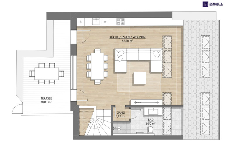 Im zweiten Dachgeschoss befindet sich der großzügige Wohnbereich der Wohnung. Das rund 52 Quadratmeter große Wohn-Esszimmer bietet ein offenes, lichtdurchflutetes Raumgefühl und vielfältige Gestaltungsmöglichkeiten für Wohnen und Essen. Zusätzlich stehen auf dieser Ebene ein Badezimmer mit WC mit knapp 10 Quadratmetern sowie eine rund 19 Quadratmeter große Sonnenterrasse zur Verfügung, die den Wohnraum ideal nach außen erweitert.