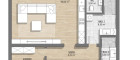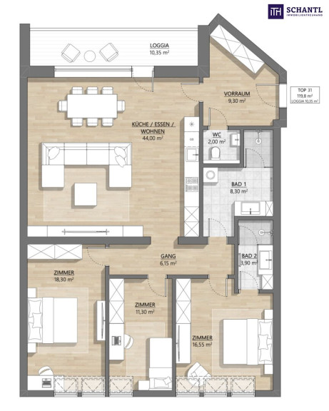 Über den rund 9 Quadratmeter großen Vorraum gelangt man in die zentral gelegene Wohn-Essküche, die mit etwa 44 Quadratmetern den Mittelpunkt der Wohnung bildet. Der offene Koch-, Ess- und Wohnbereich bietet viel Platz für gemeinsames Wohnen und ist dank der großzügigen Raumgestaltung besonders hell und einladend. Von hier aus ist auch die südseitig ausgerichtete Loggia direkt begehbar, die den Wohnraum ideal erweitert und zu sonnigen Stunden im Freien einlädt.