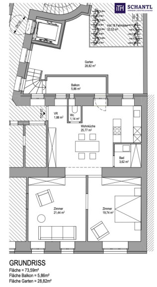 Wohnfläche: ca. 73,59 m² + Balkon: ca. 5,86 m² + Garten: ca. 28,82 m² + Kellerabteil