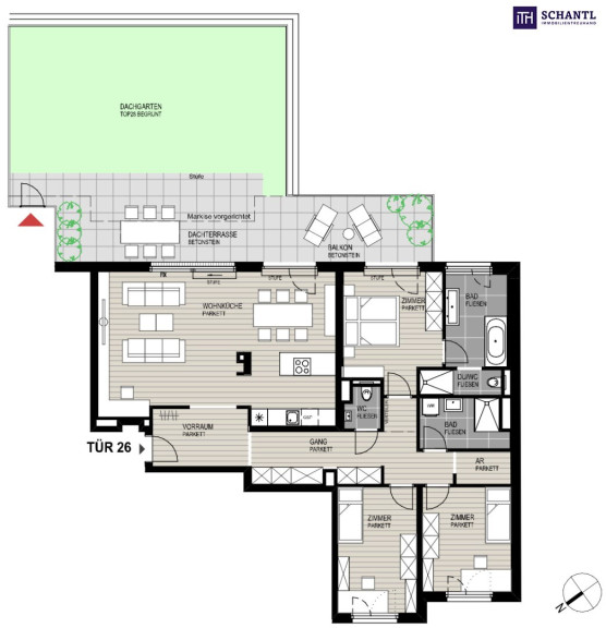 Diese Wohnung beeindruckt mit einem großzügigen Raumangebot und dem genialen Zusammenspiel zwischen sonnigem Garten und Fernblick. Viel Platz für gemütliche Abende mit Familie und Freunden finden Sie in dem über 43 Quadratmeter großen Wohn- Essbereich, mit der ideal geplanten Kochecke, die die Herzen von Hobbyköchen mit Sicherheit höher schlagen lässt. Drei wunderbar geschnittene Zimmer, die sich perfekt als Schlafzimmer, Kinderzimmer, oder Arbeitszimmer nutzen lassen, zwei modern gestaltete Badezimmer (eines mit Tageslicht) mit Dusche, Badewanne, ein separates Gäste-WC, sowie der sehr nützliche Abstellraum ergänzen das Raumangebot dieser genial gestalteten Wohnung.