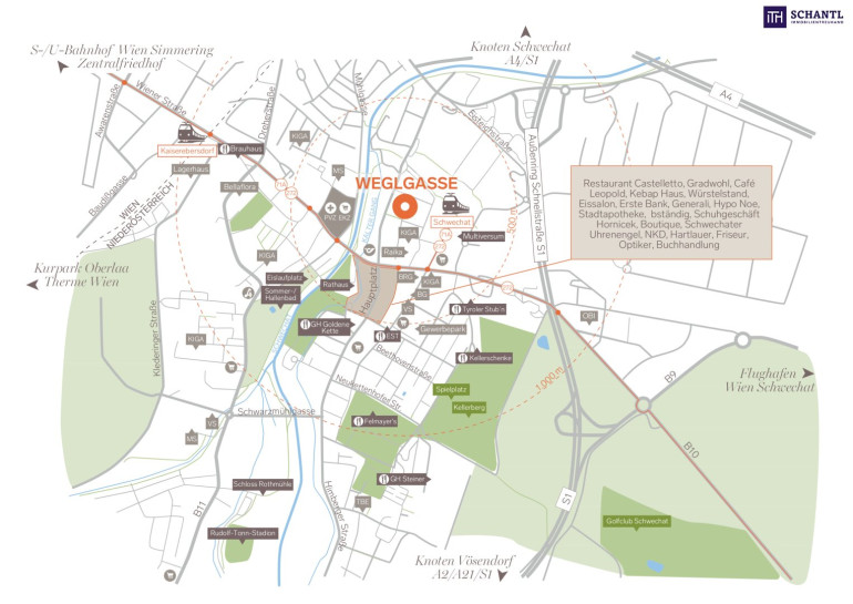 Willkommen in DAS WEGL - Hier finden Sie Ihre neue Traumwohnung in einer ruhigen und dennoch bestens angebundenen Wohnlage in Schwechat bei Wien! Genießen Sie das Beste aus zwei Welten: die entspannte Atmosphäre einer charmanten Wohngegend und die schnelle Verbindung nach Wien sowie zum Flughafen. Die Schnellbahnstation (13 min nach Wien Mitte-Landstraße), Einkaufsmöglichkeiten, Restaurants und viele weitere wichtige Örtlichkeiten des täglichen Bedarfs befinden sich nur einen Katzensprung entfernt. Ob gemütlicher Spaziergang in einem Naherholungsgebiet oder urbanes Leben - diese Lage bietet Flexibilität und Lebensqualität in perfekter Balance!