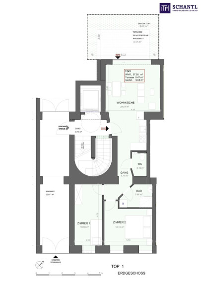 Wohnfläche: ca. 58 m² + 9 m² Terrasse + 10 m² Garten