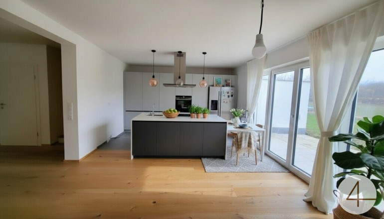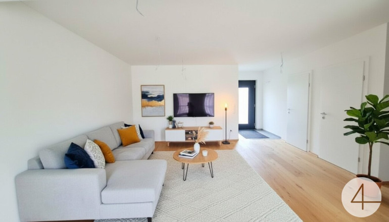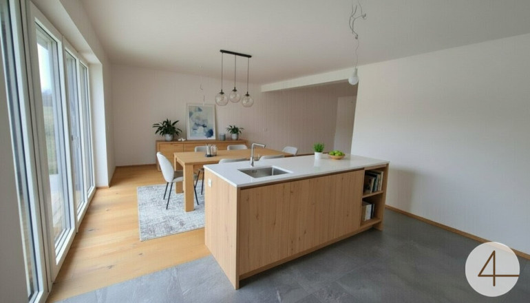 Die schöne große Raumaufteilung sorgt für eine helle und freundliche Atmosphäre. Der offene Wohn- und Essbereich ist ideal für gesellige Abende mit Freunden und Familie, während die großen Fenster viel Tageslicht hereinlassen. Von dort aus gelangen Sie auf Ihre Terrasse wo Sie Ihre Seele baumeln lassen können. In Ihrer zukünftigen Küche können Sie ideal für die Zubereitung von Speisen sorgen.