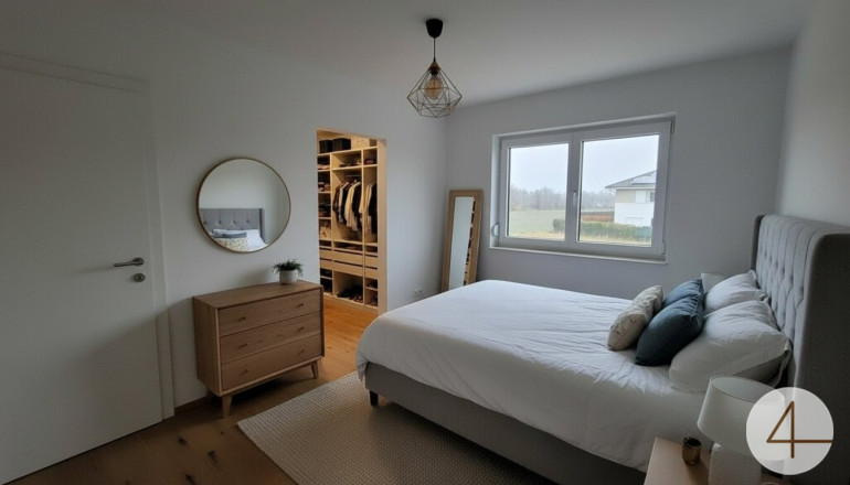 Das geräumige Schlafzimmer ist mit einem praktischen Ankleideraum ausgestattet, der Ihnen genügend Platz für Ihre Garderobe bietet. Hier bleiben keine Wünsche offen!