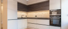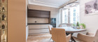 Der edle Fischgrät-Parkettboden verleiht dem Wohnraum zeitlose Eleganz. Die maßgefertigte Einbauküche mit hochwertigen Markengeräten fügt sich nahtlos in das stilvolle Gesamtbild ein. Raffinierte Details wie integrierte Vitrinenelemente und flächenbündige Fronten unterstreichen den exklusiven Anspruch. Teilweise vorhandene elektrische Raffstores bieten zusätzlichen Komfort und Privatsphäre.