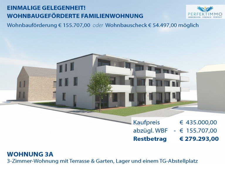 Wohnbauförderung möglich! 3-Zimmer-Neubauwohnung Top W 3A mit Terrasse & Garten sowie 1 TG-Platz
