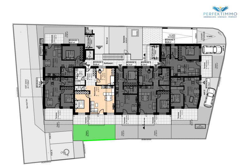 17 moderne Wohnungen auf drei Etagen mit großzügigen Freiflächen (Balkone, Terrassen, Gärten)