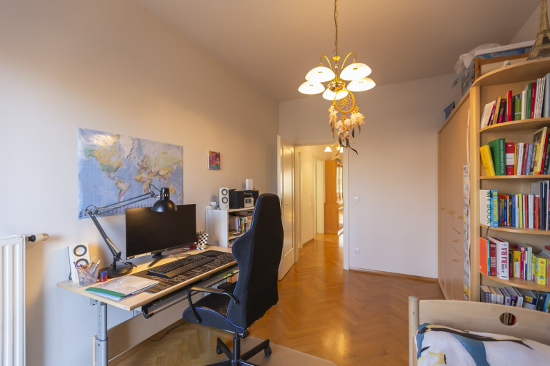 Wohnzimmer mit Zugang zum 1. Balkon (9,77m2), Schlafzimmer mit Zugang zum 2. Balkon (3,55m2), Arbeitszimmer mit Zugang zum 2. Balkon (3,55m2), zentrales Vorzimmer,