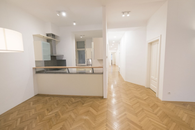 Renovierte Wohnung, 157 m2 im 3. Stock mit Aufzug. Wohnzimmer mit kompletter und öffenbarer Fenster-Front zum grünen Innenhof gerichtet, 3 Schlafzimmer (1 mit en-suite-Bad, 1 mit begehbarem Schrankraum), 2 Bäder, 3 WCs, Küche, separater Wirtschaftsraum mit Waschmaschine und Wäschetrockner. Unmöbliert (ausser Küche, Hauptbad, Schrankraum). Kellerabteil. Hinweis: Die beiden Bäder sowie das WC im Vorraum/Korridor wurden erst kürzlich general-erneuert.