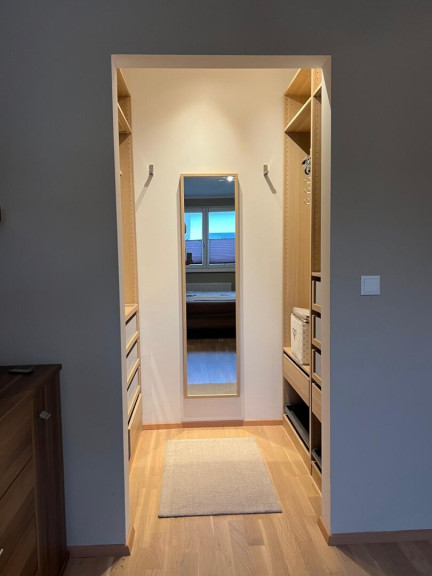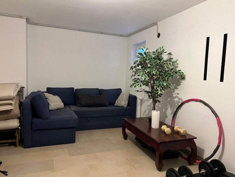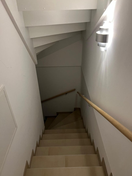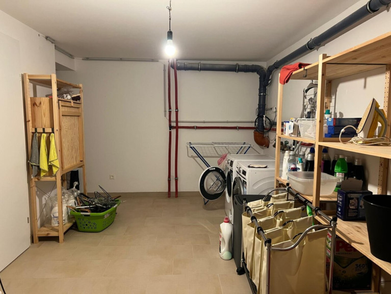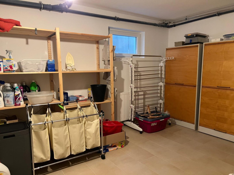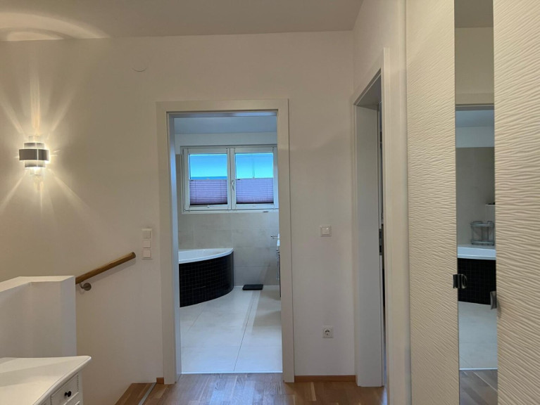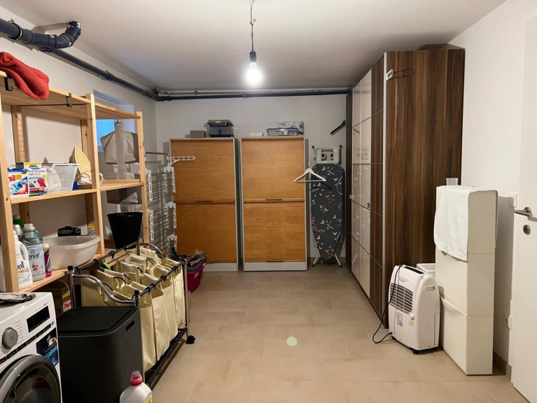 Vorraum, gegliedertes Wohnzimmer (Wohnbereich / Essbereich) mit offener Küche, kleiner Garten mit Swimming-Pool, Stiegenaufgang - oben offen zur Galerie, 3 Schlafzimmer (Schlafzimmer mit begehbaren Schrankraum, Kinderzimmer, Büro), geräumiges Bad (mit Fenster) mit 2 Waschbecken, Wanne, Dusche, WC. Keller: Wohn-/Fitness-/Hobby-Raum, großer Lagerraum mit Regalen mit Waschmaschine und Trockner, Haustechnik-Raum mit Lagerbereich (Regale) und Tiefkühlschrank.