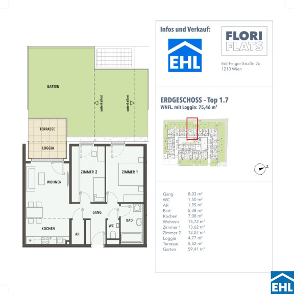 Die 3 Zimmerwohnung ist westseitig in Richtung eines wunderschönen Grüngürtels ausgerichtet und somit absolut ruhig gelegen. Sowohl von der Wohnküche, als auch von den beiden Schlafzimmern aus, gelangen Sie direkt in den Eigengarten, der weiters über eine teilweise überdachte Terrasse verfügt.