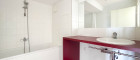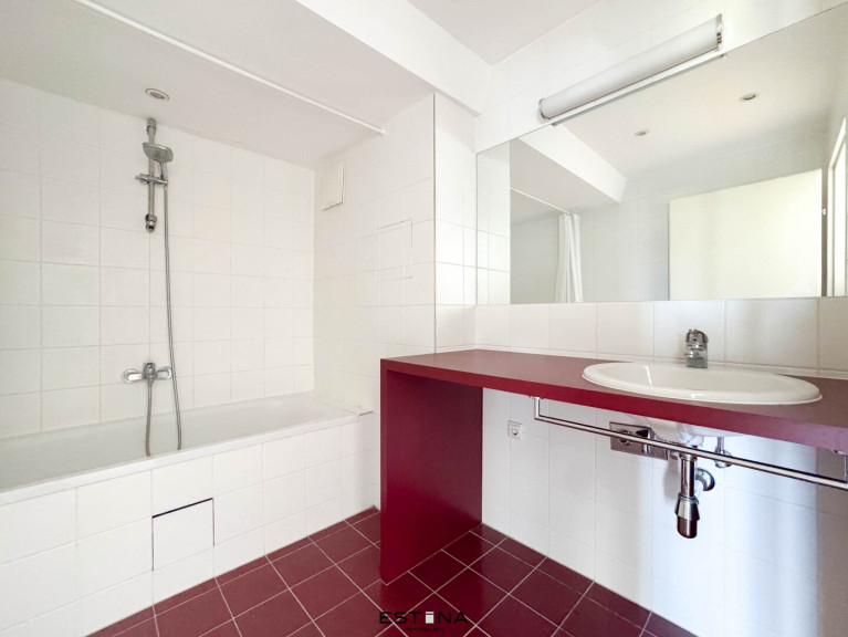 - Badezimmer mit Badewanne, Waschbecken und Waschmaschinenanschluss