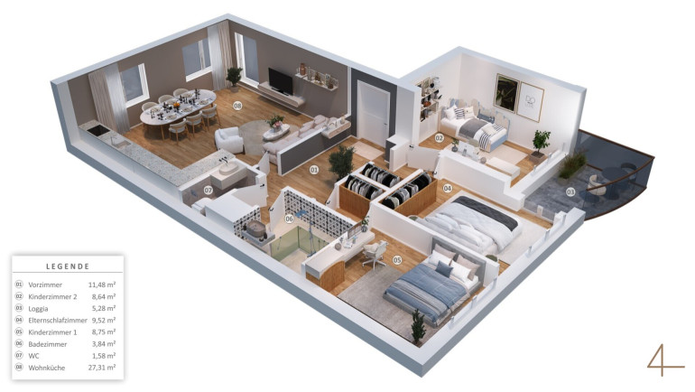 Die Wohnung wurde mit Unterstützung einer Innenarchitektin hochwertig gestaltet und ausgestattet. Großzügiger Wohn-Essbereich mit Loggia, drei Zimmer, getrenntes Bad und WC, großes Kellerabteil sowie Garagenplatz. Bezugsfertig – einziehen und wohlfühlen.